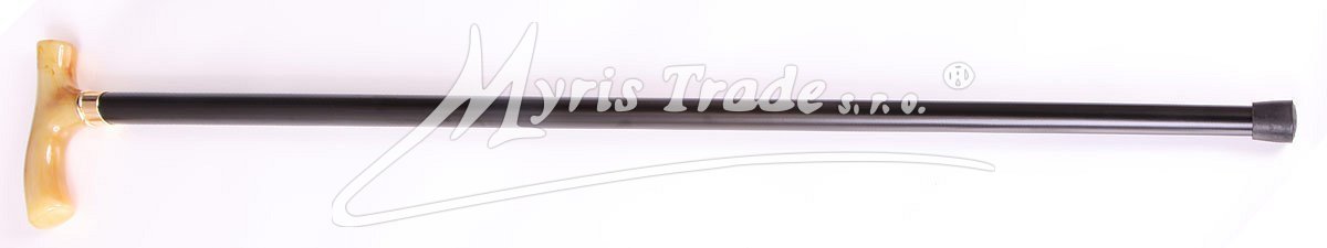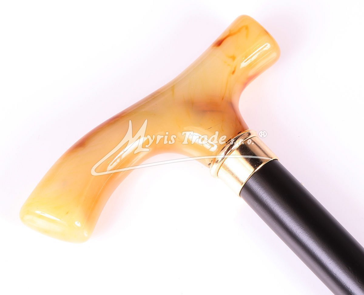 plně funkční vycházková hůl z masivního, černého dřeva s rovnou elegantní rukojetí imitující jantar a mosaznou ozdobu, umožňující pevné opření ruky