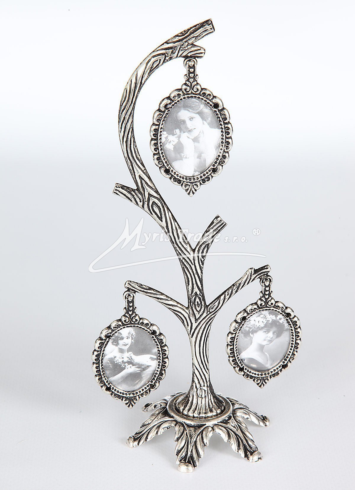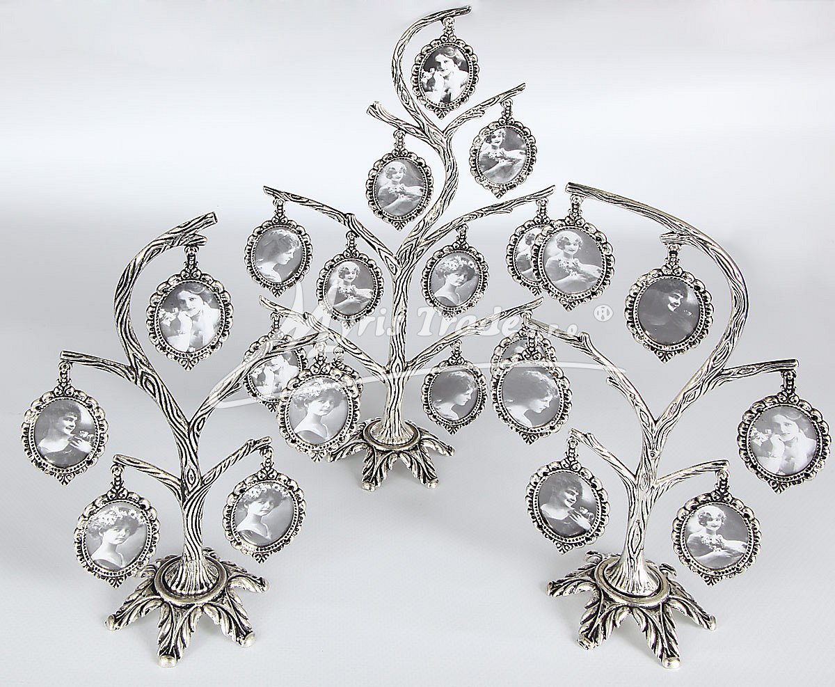 postříbřený fotorámeček ve tvaru stromu se 3 fotopřívěsky určenými pro rodinné foto