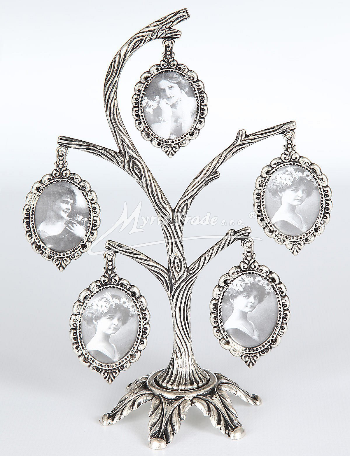 postříbřený fotorámeček ve tvaru stromu s 5 fotopřívěsky určenými pro rodinné foto, ze kterého můžete vytvořit malý genealogický strom vaší rodiny