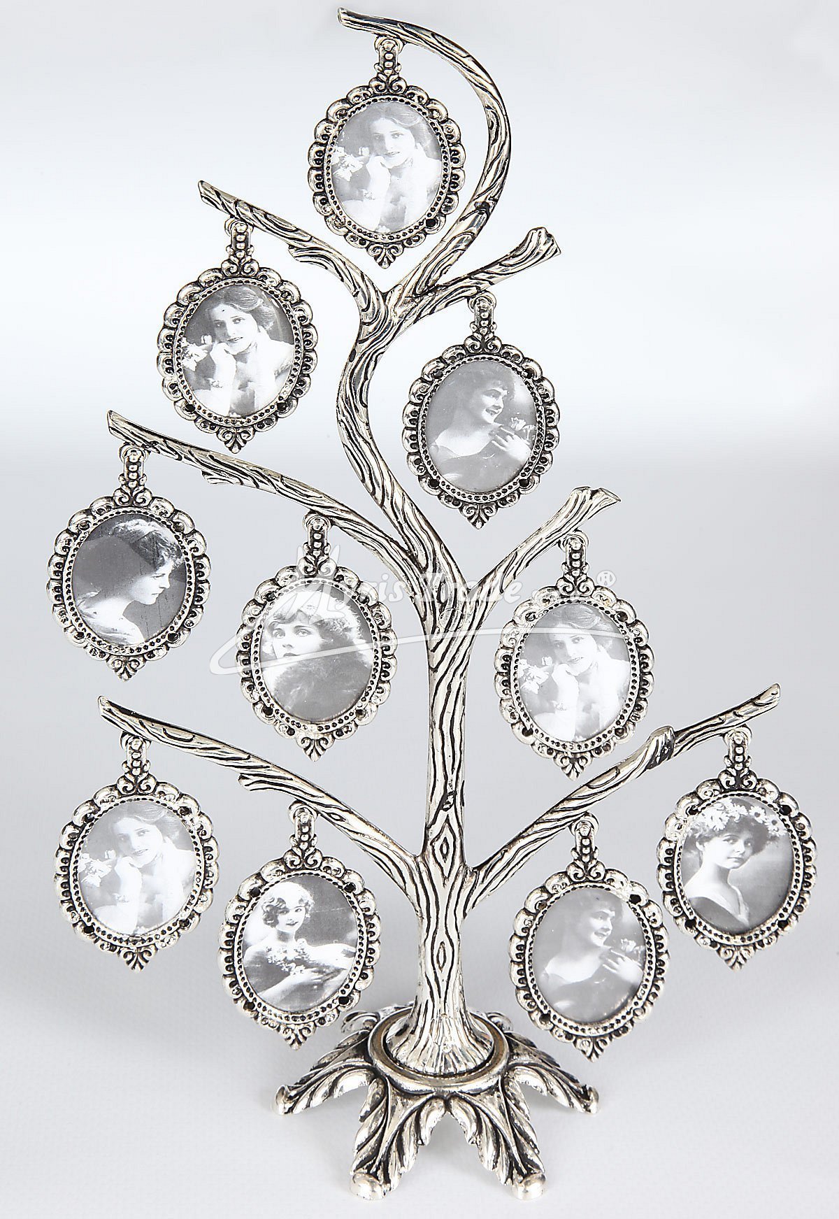 postříbřený fotorámeček ve tvaru stromu s 10 fotopřívěsky určenými pro rodinné foto, ze kterého můžete vytvořit malý genealogický strom vaší rodiny