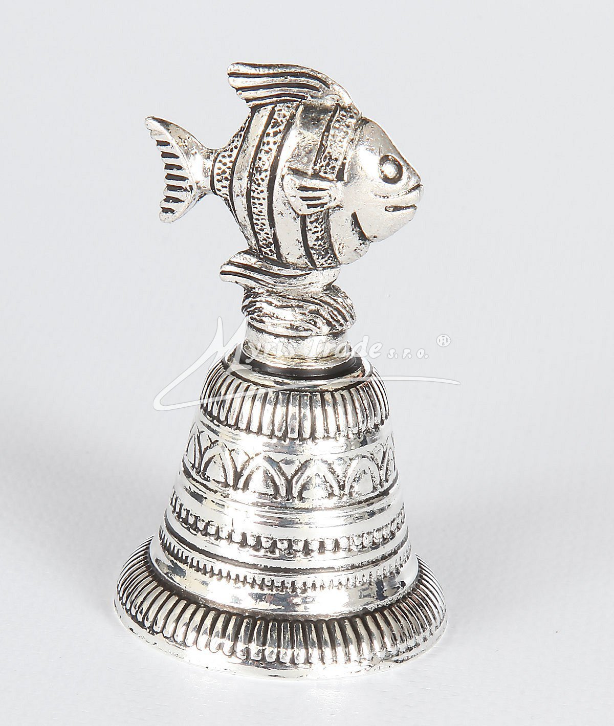 gravírovaný zvoneček s figurkou ryby, postříbřený