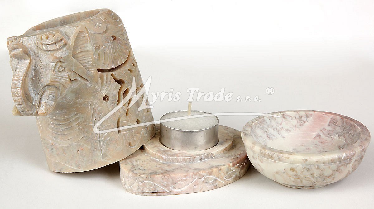 bohatě vyřezávaná aromalampa na čajovou svíčku a aromaolej v podobě slona je ručně vyrobena z mastku, jednoho z nejměkčích kamenů