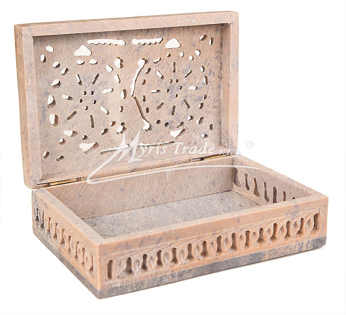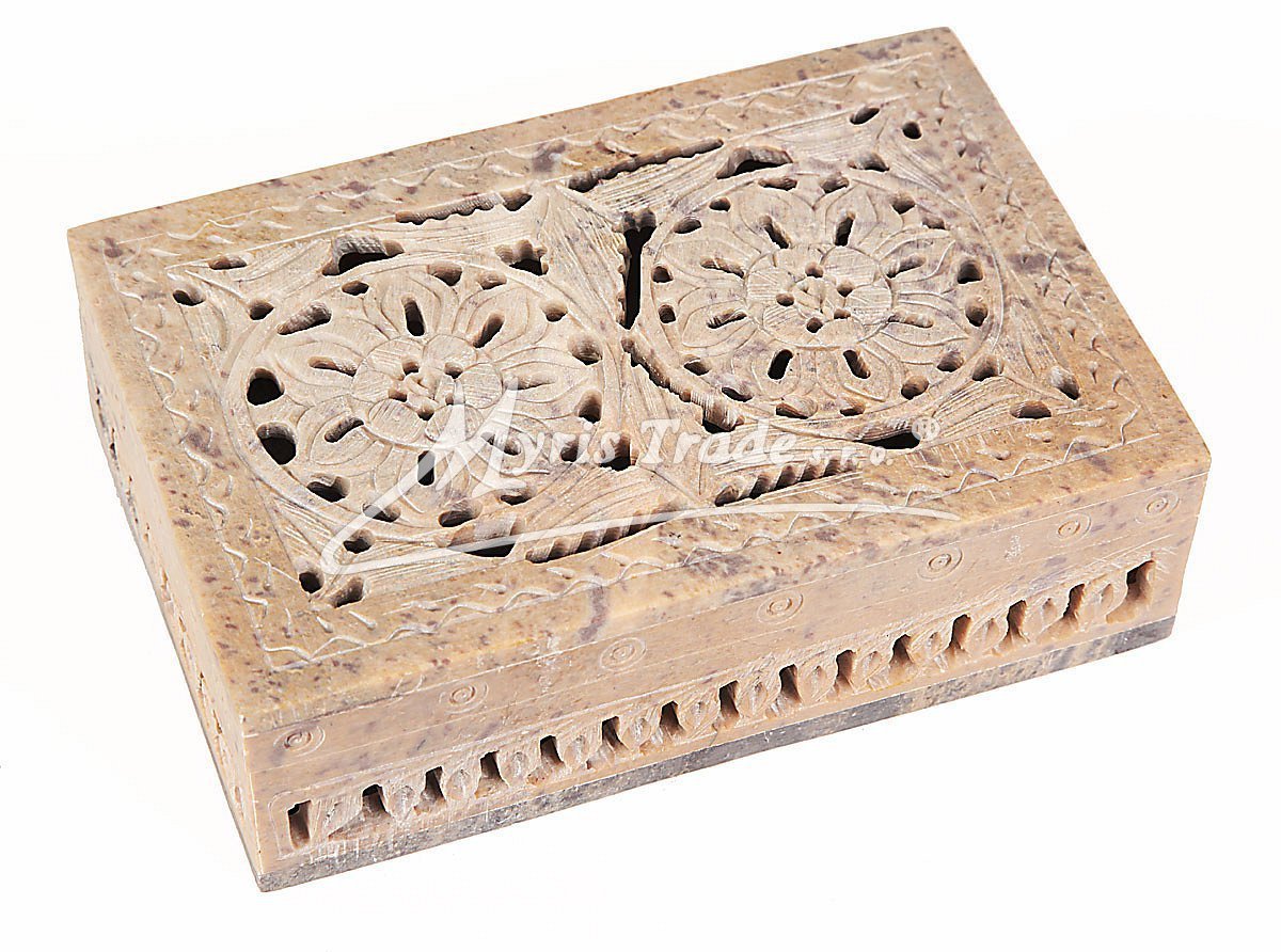 Šperkovnice z mastku s bohatě vyřezávaným víkem. Barva na obrázku je orientační. Každý kus je originální, a má svoji vlastní barvu a žíhání kamene. Žádný kus není stejný.