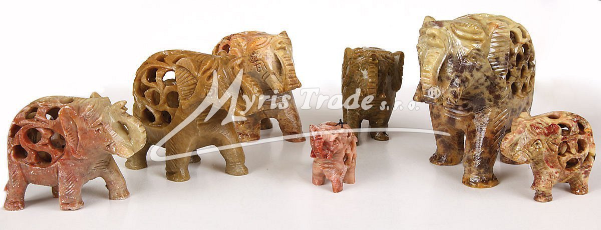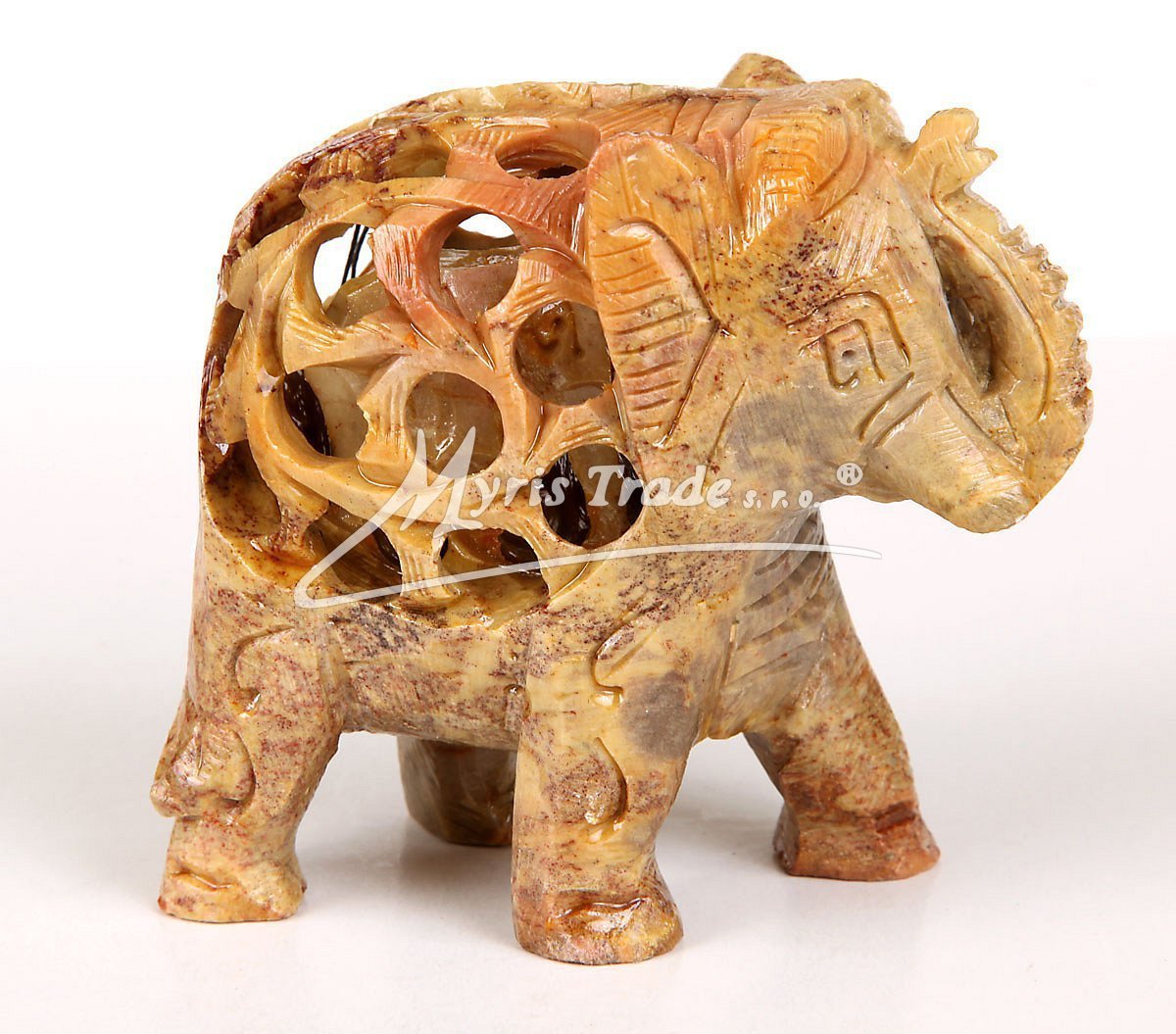 ručně vyřezávaná figurka slona z barevného a leštěného kamene. Každý kus je originál vzhledem k různému zbarvení a žilkování kamene. Uvnitř slona je vyřezána další figurka.