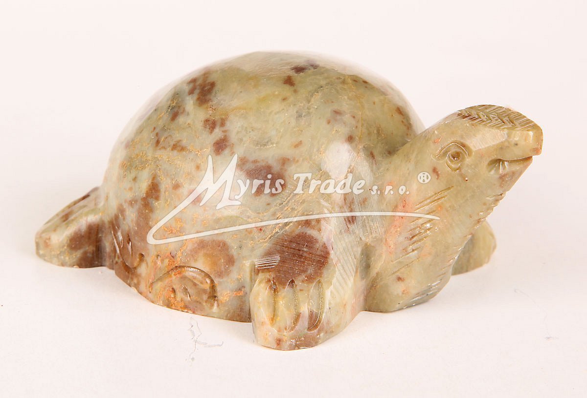Ručně vyřezávaná figurka želvy z barevného a leštěného kamene. Každý kus je originál vzhledem k různému zbarvení a žilkování kamene. Lze ji používat jako těžítko.