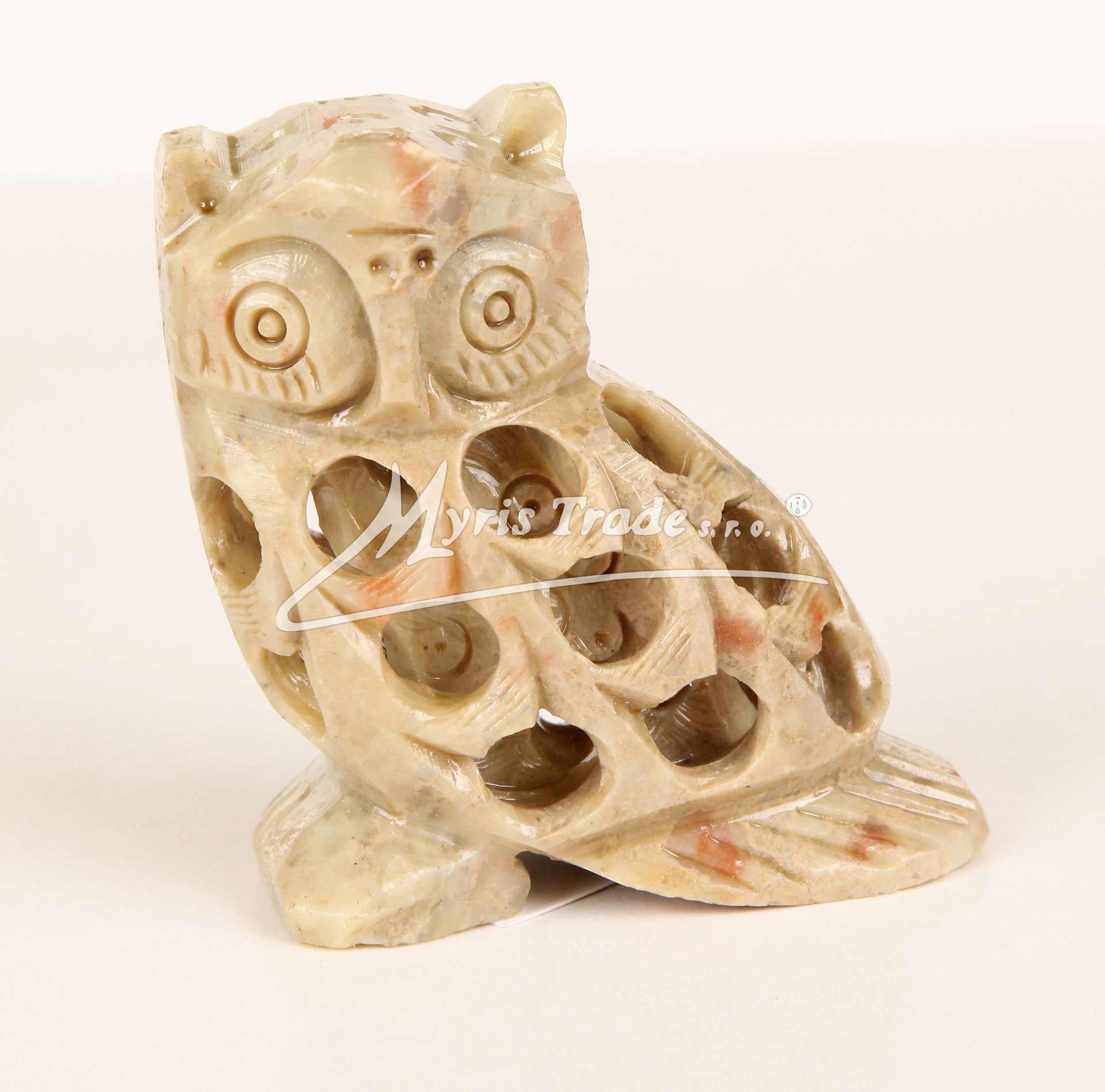 Ručně vyřezávaná figurka sovy z barevného a leštěného kamene. Každý kus je originál vzhledem k různému zbarvení a žilkování kamene.