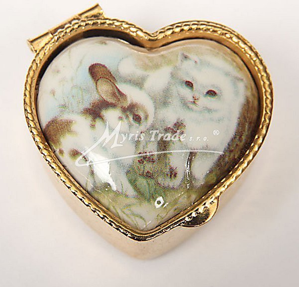 malá lékovka ve tvaru srdíčka je vyrobena z kovu zlaté barvy s porcelánovým víčkem s romantickým motivem zvířátek