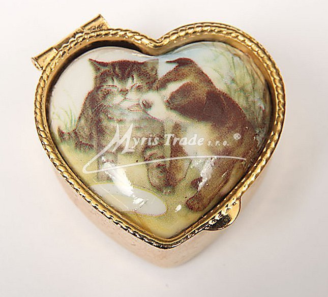 malá lékovka ve tvaru srdíčka je vyrobena z kovu zlaté barvy s porcelánovým víčkem s romantickým motivem zvířátek