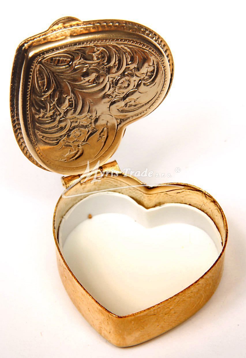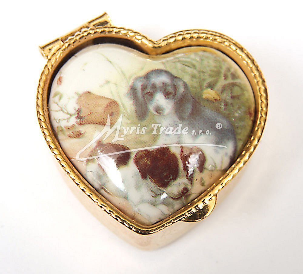 malá lékovka ve tvaru srdíčka je vyrobena z kovu zlaté barvy s porcelánovým víčkem s romantickým motivem zvířátek