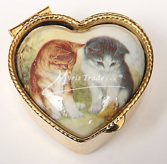 malá lékovka ve tvaru srdíčka je vyrobena z kovu zlaté barvy s porcelánovým víčkem s romantickým motivem zvířátek