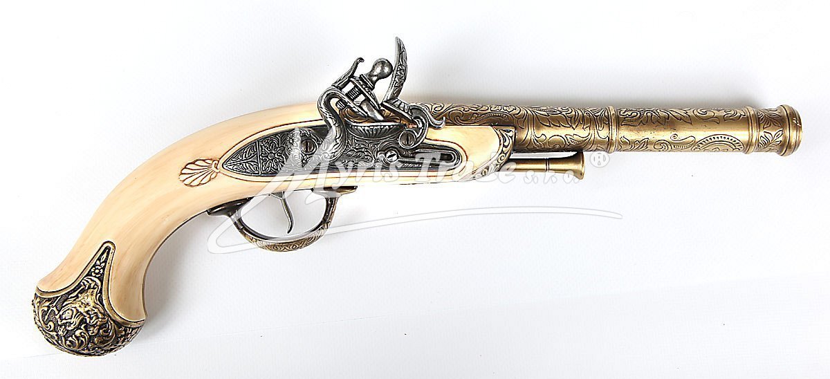 luxusně provedená nefunkční replika historické křesadlové pistole z dokonalé imitace slonové kosti a kovu barvy bronzu