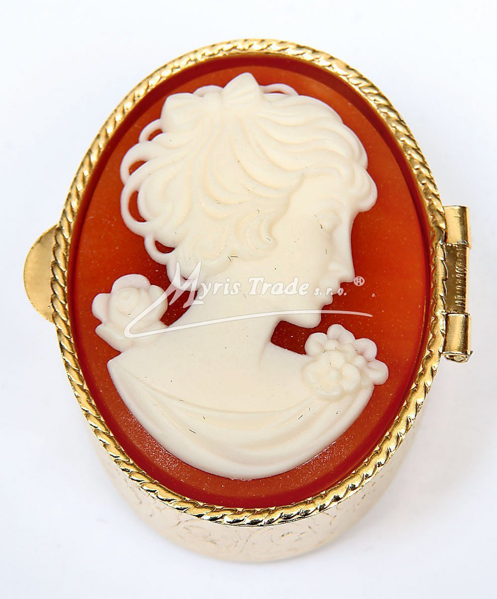 oválná lékovka je vyrobena z kovu zlaté barvy s ozdobným víčkem s kamejí v barvě korálu a slonové kosti