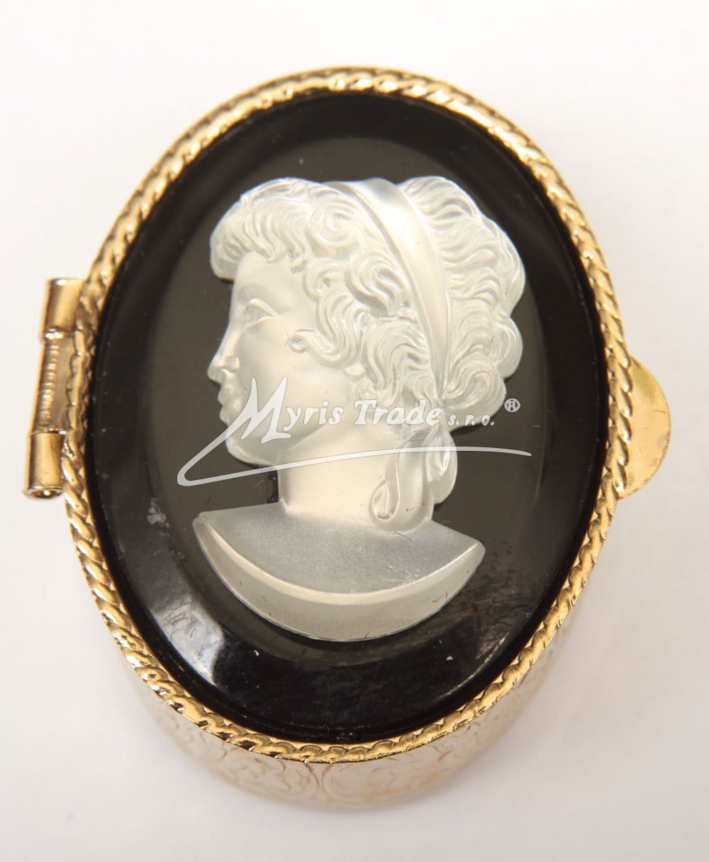 oválná lékovka je vyrobena z kovu zlaté barvy s ozdobným víčkem s kamejí v barvě černé a bílé