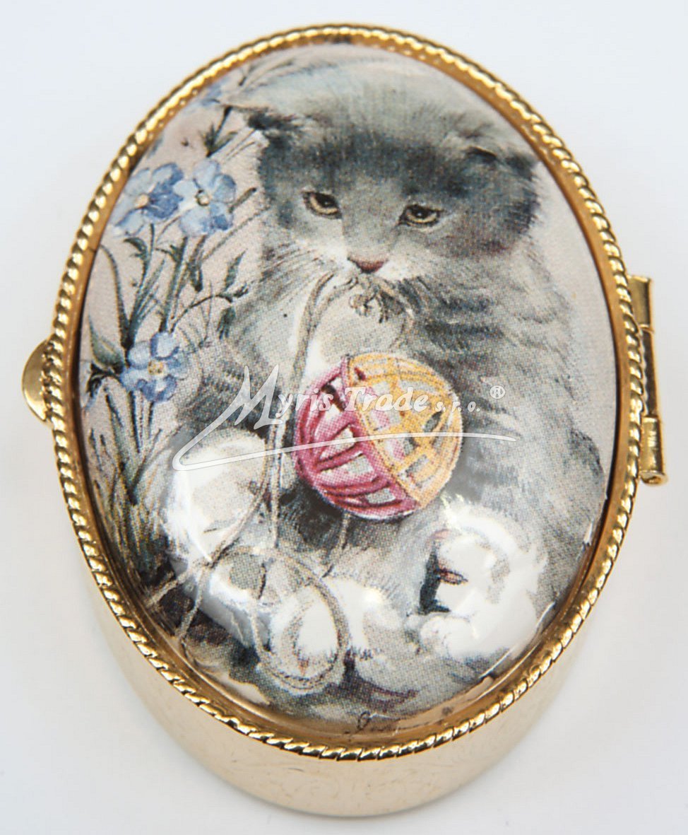 oválná lékovka je vyrobena z kovu zlaté barvy s porcelánovým víčkem s motivem kočičky