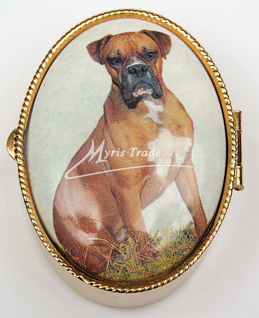 oválná lékovka je vyrobena z kovu zlaté barvy s porcelánovým víčkem s motivem psa
