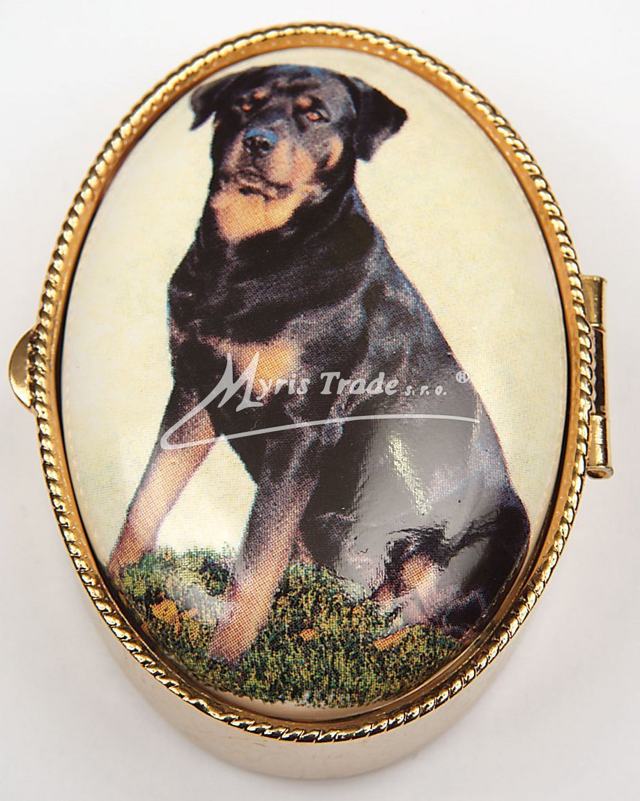 oválná lékovka je vyrobena z kovu zlaté barvy s porcelánovým víčkem s motivem psa