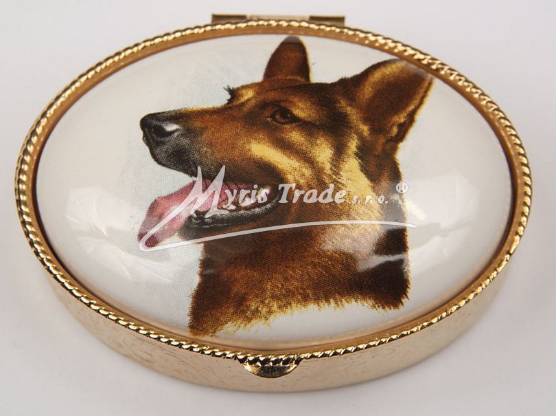oválná lékovka je vyrobena z kovu zlaté barvy s porcelánovým víčkem s motivem hlavy psa