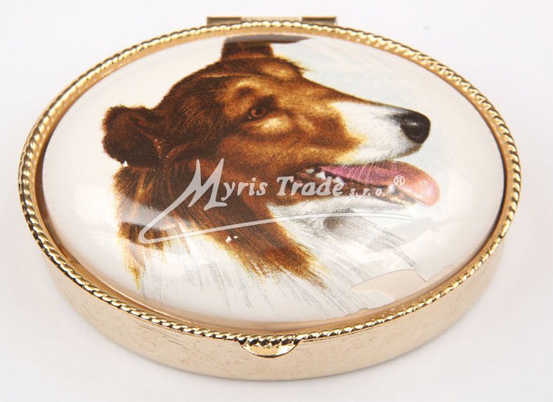oválná lékovka je vyrobena z kovu zlaté barvy s porcelánovým víčkem s motivem hlavy psa