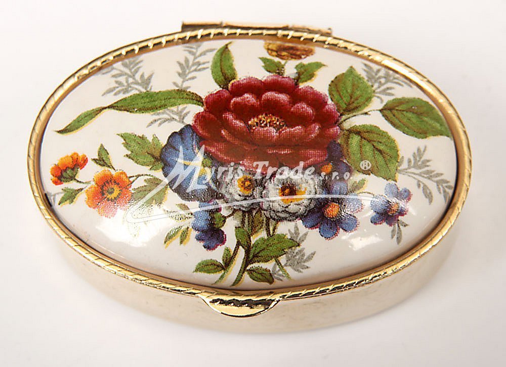 klasická oválná lékovka je vyrobena z kovu zlaté barvy s porcelánovým víčkem s květinovým motivem