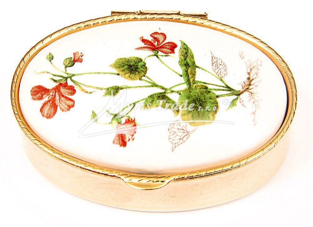 klasická oválná lékovka je vyrobena z kovu zlaté barvy s porcelánovým víčkem s květinovým motivem