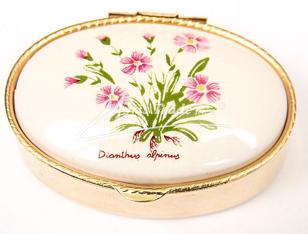 klasická oválná lékovka je vyrobena z kovu zlaté barvy s porcelánovým víčkem s květinovým motivem
