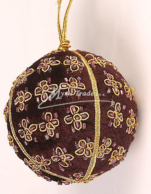 Textilní vánoční koule s korálky. Vánoční koule je ručně pošívaná korálky a kovovým drátkem ve zlaté barvě.