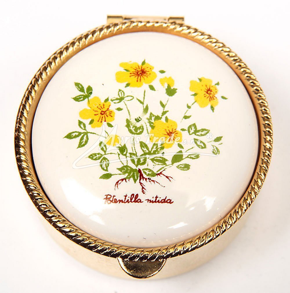 klasická kulatá lékovka je vyrobena z kovu zlaté barvy s porcelánovým víčkem s květinovým motivem