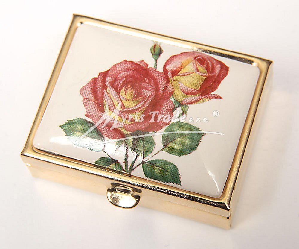klasická obdélníková lékovka je vyrobena z kovu zlaté barvy s porcelánovým víčkem s květinovým motivem