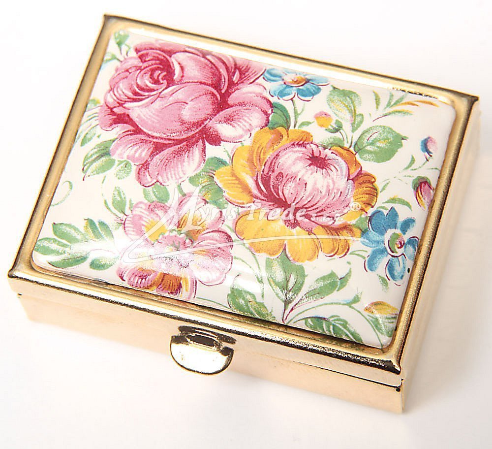 klasická obdélníková lékovka je vyrobena z kovu zlaté barvy s porcelánovým víčkem s květinovým motivem