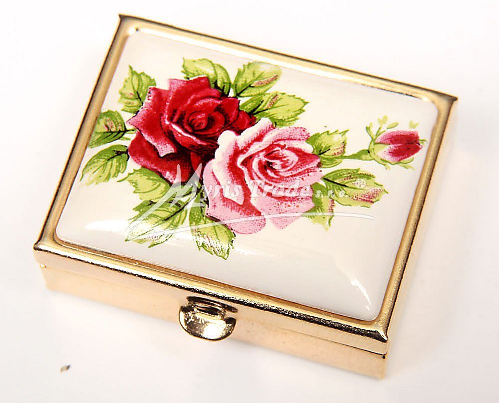klasická obdélníková lékovka je vyrobena z kovu zlaté barvy s porcelánovým víčkem s květinovým motivem