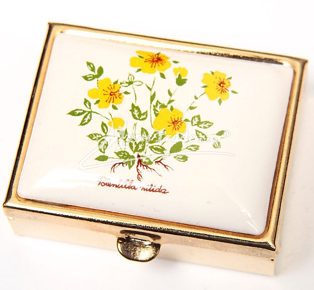 klasická obdélníková lékovka je vyrobena z kovu zlaté barvy s porcelánovým víčkem s květinovým motivem
