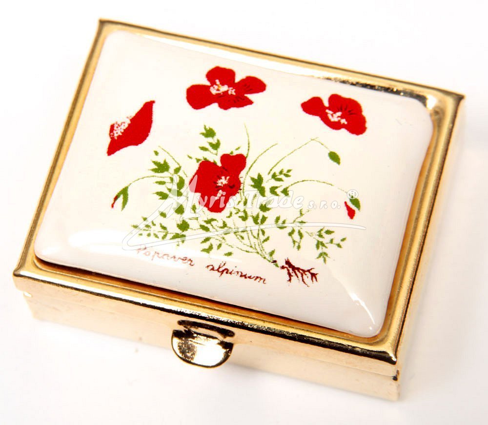klasická obdélníková lékovka je vyrobena z kovu zlaté barvy s porcelánovým víčkem s květinovým motivem