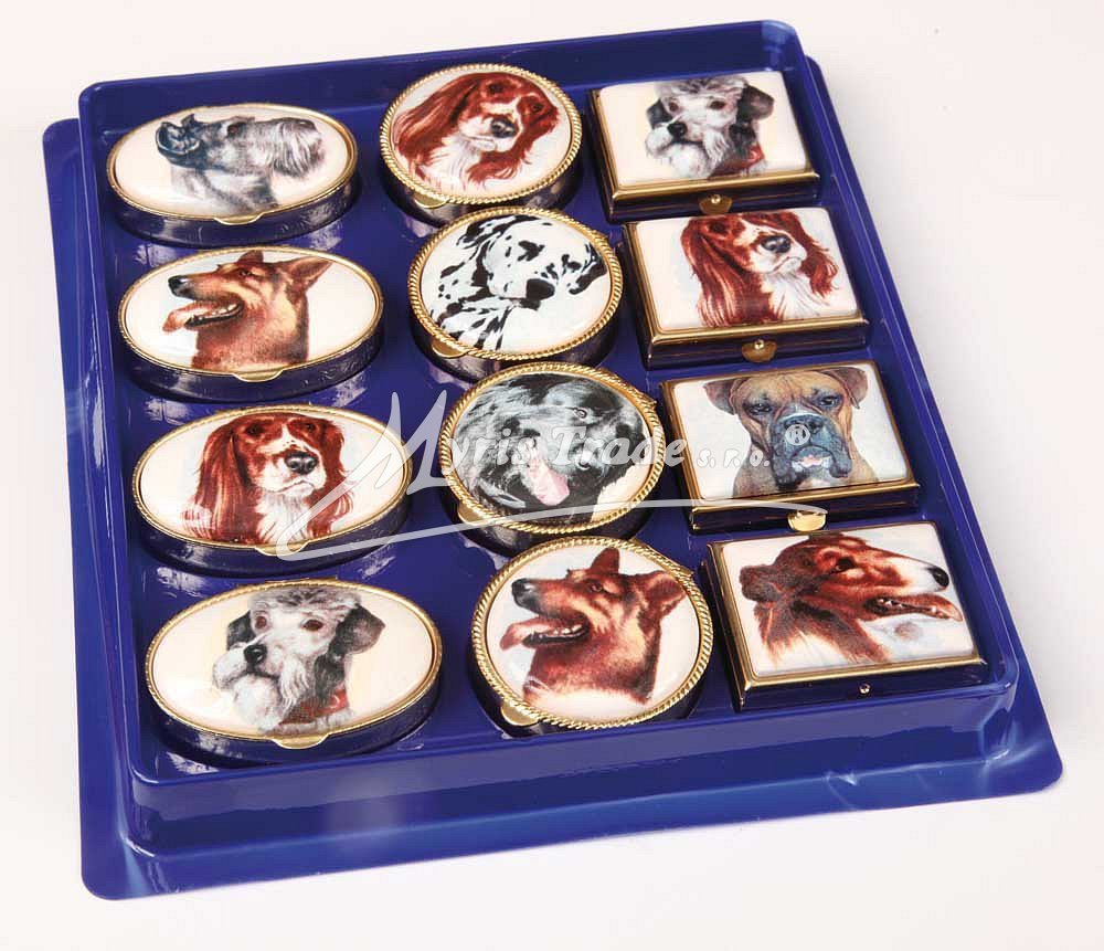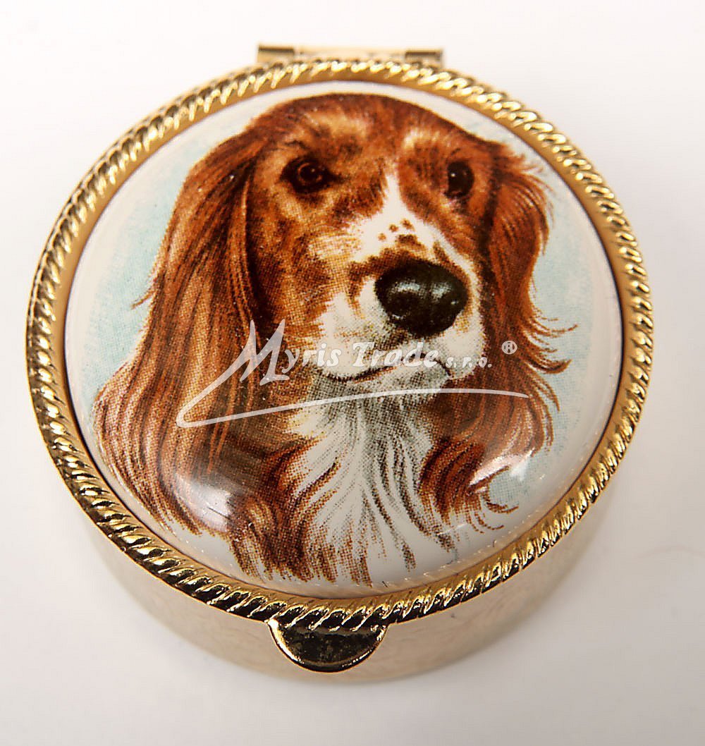 klasická kulatá lékovka je vyrobena z kovu zlaté barvy s porcelánovým víčkem s motivem hlavy psa