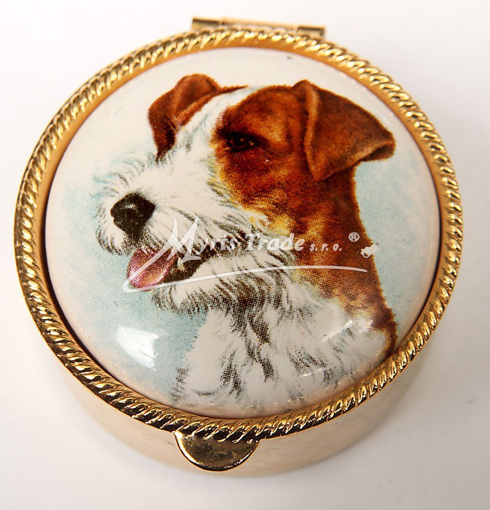 klasická kulatá lékovka je vyrobena z kovu zlaté barvy s porcelánovým víčkem s motivem hlavy psa