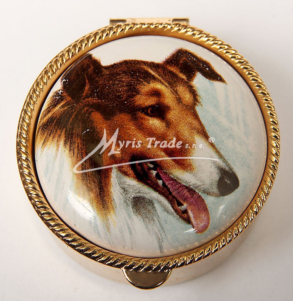 klasická kulatá lékovka je vyrobena z kovu zlaté barvy s porcelánovým víčkem s motivem hlavy psa
