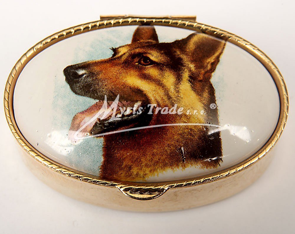 klasická oválná lékovka je vyrobena z kovu zlaté barvy s porcelánovým víčkem s motivem hlavy psa