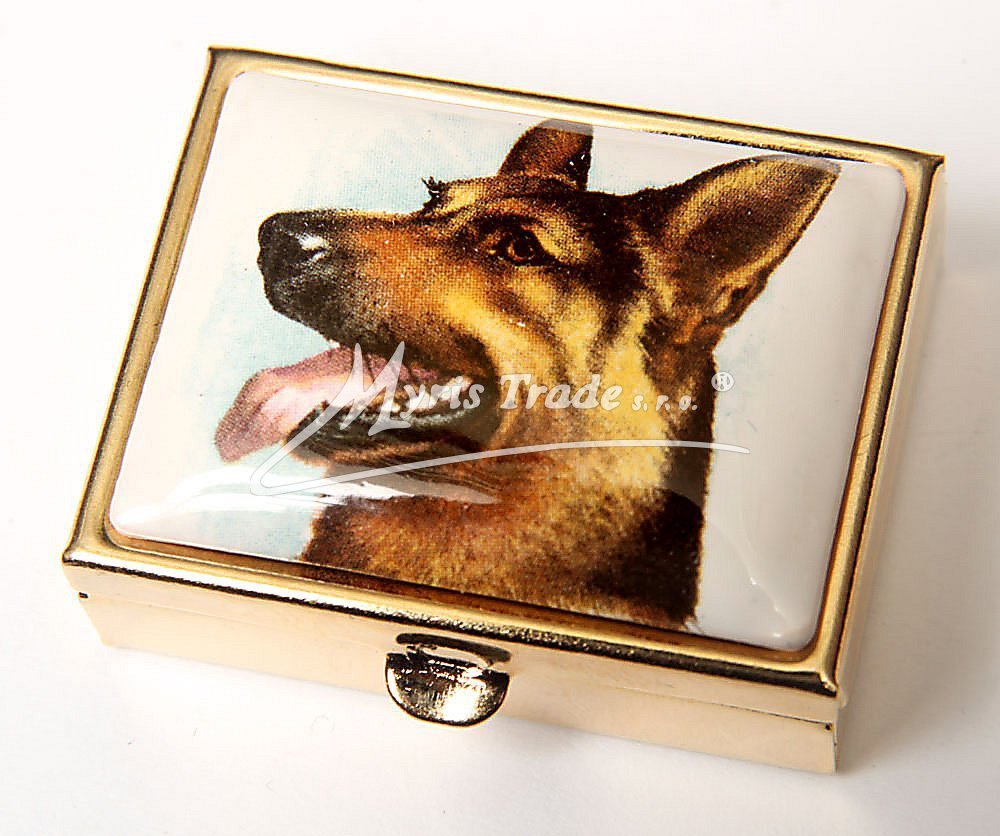 klasická obdélníková lékovka je vyrobena z kovu zlaté barvy s porcelánovým víčkem s motivem hlavy psa