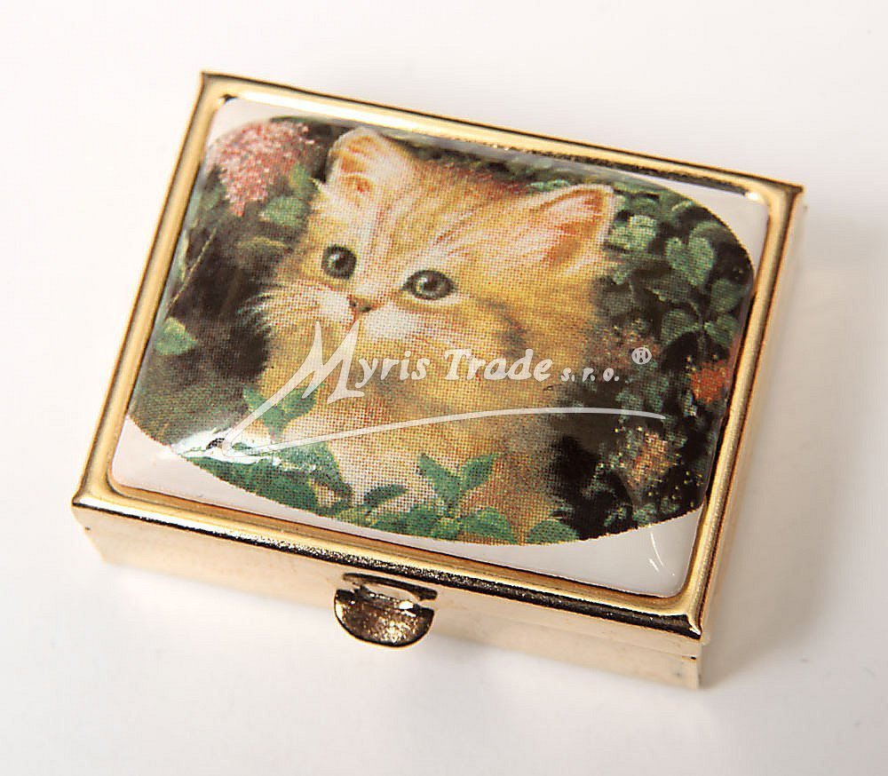 klasická obdélníková lékovka je vyrobena z kovu zlaté barvy s porcelánovým víčkem s motivem kočičky