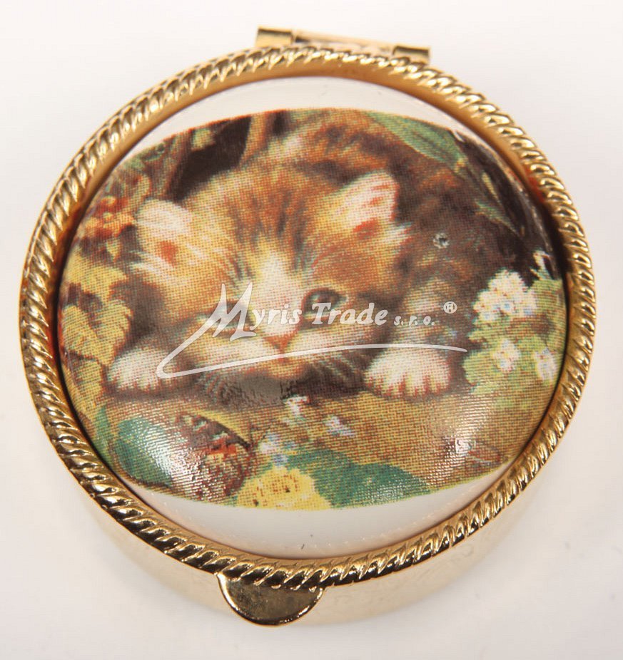 klasická kulatá lékovka je vyrobena z kovu zlaté barvy s porcelánovým víčkem s motivem kočičky