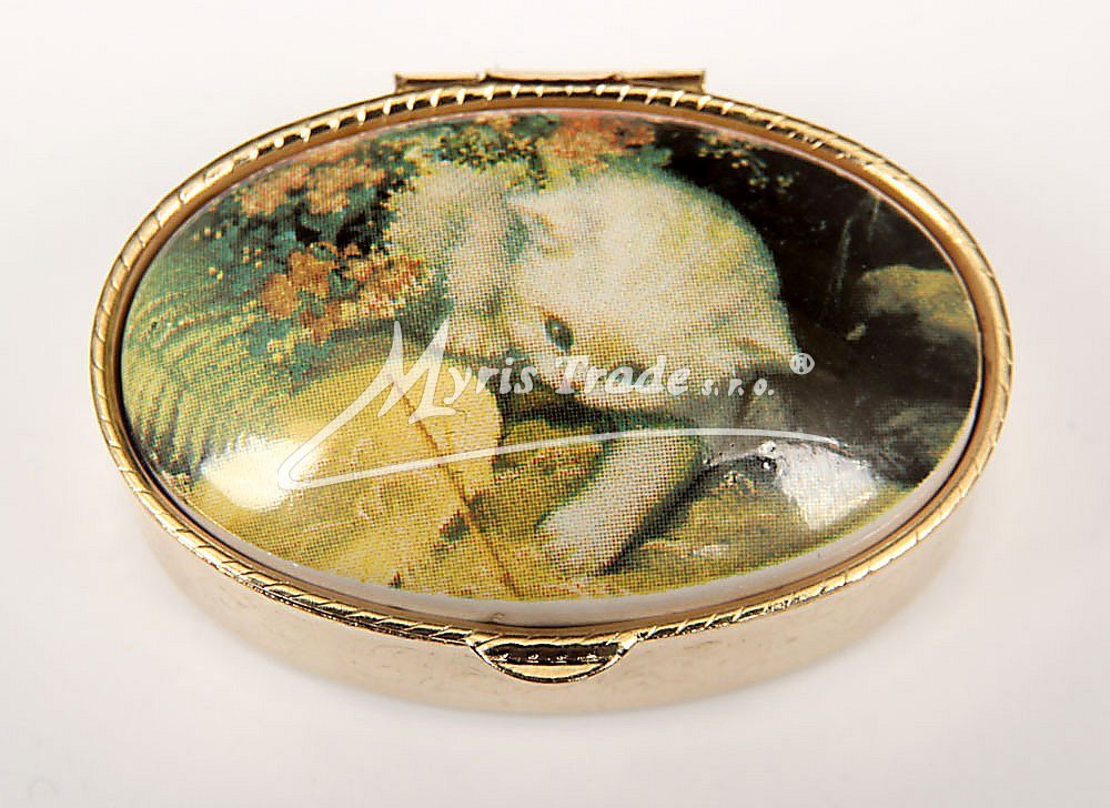 klasická oválná lékovka je vyrobena z kovu zlaté barvy s porcelánovým víčkem s motivem kočičky