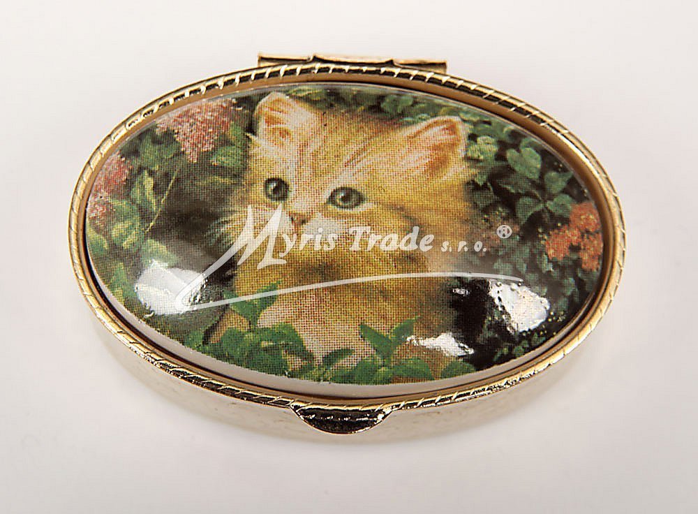 klasická oválná lékovka je vyrobena z kovu zlaté barvy s porcelánovým víčkem s motivem kočičky