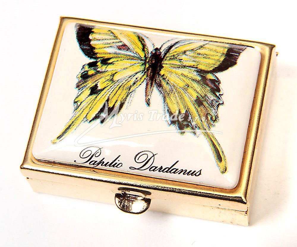 klasická obdélníková lékovka je vyrobena z kovu zlaté barvy s porcelánovým víčkem s motivem motýla