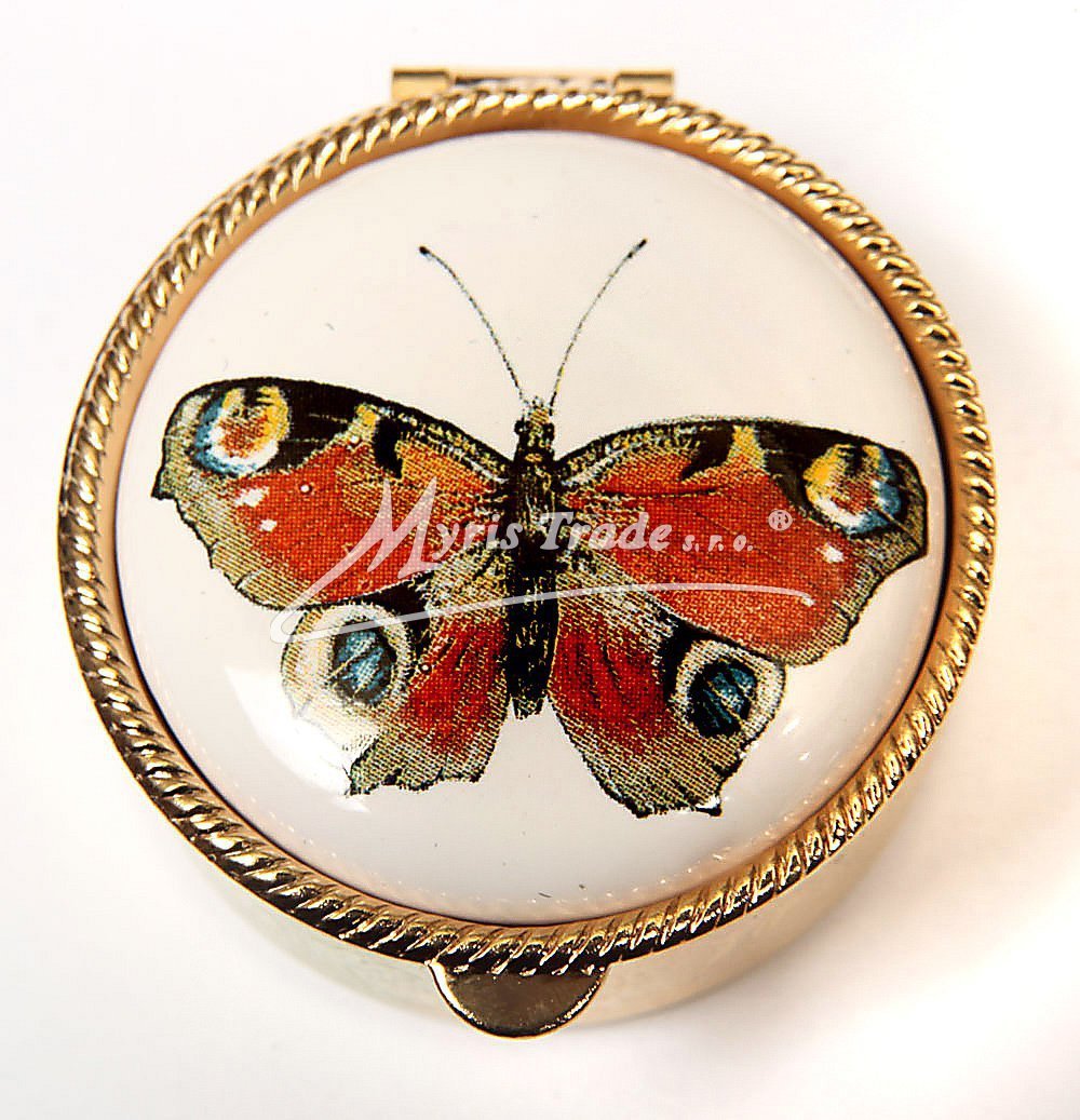 klasická kulatá lékovka je vyrobena z kovu zlaté barvy s porcelánovým víčkem s motivem motýla