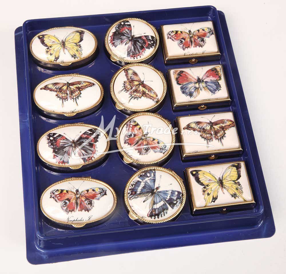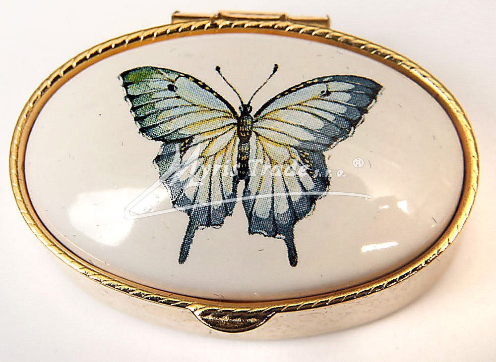 klasická oválná lékovka je vyrobena z kovu zlaté barvy s porcelánovým víčkem s motivem motýla