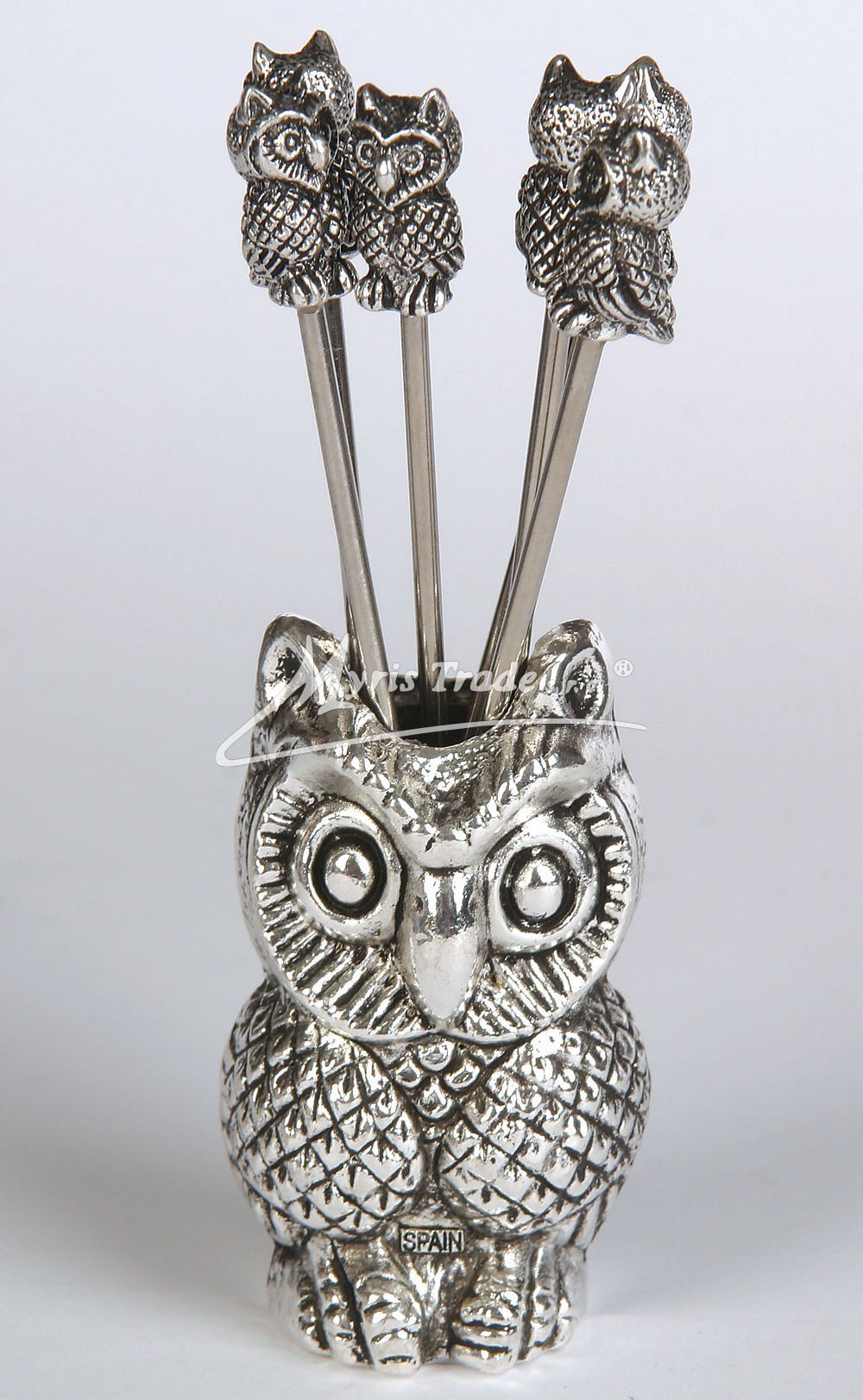 set 6ti napichovátek na olivy a jiné jednohubky s podstavcem ve tvaru sovy