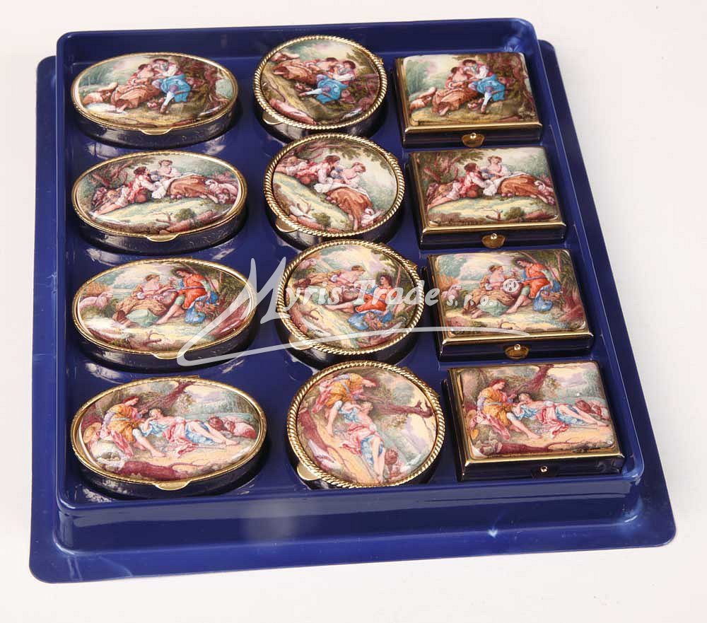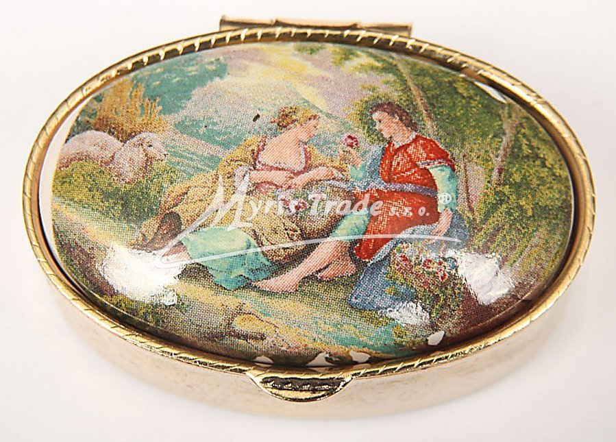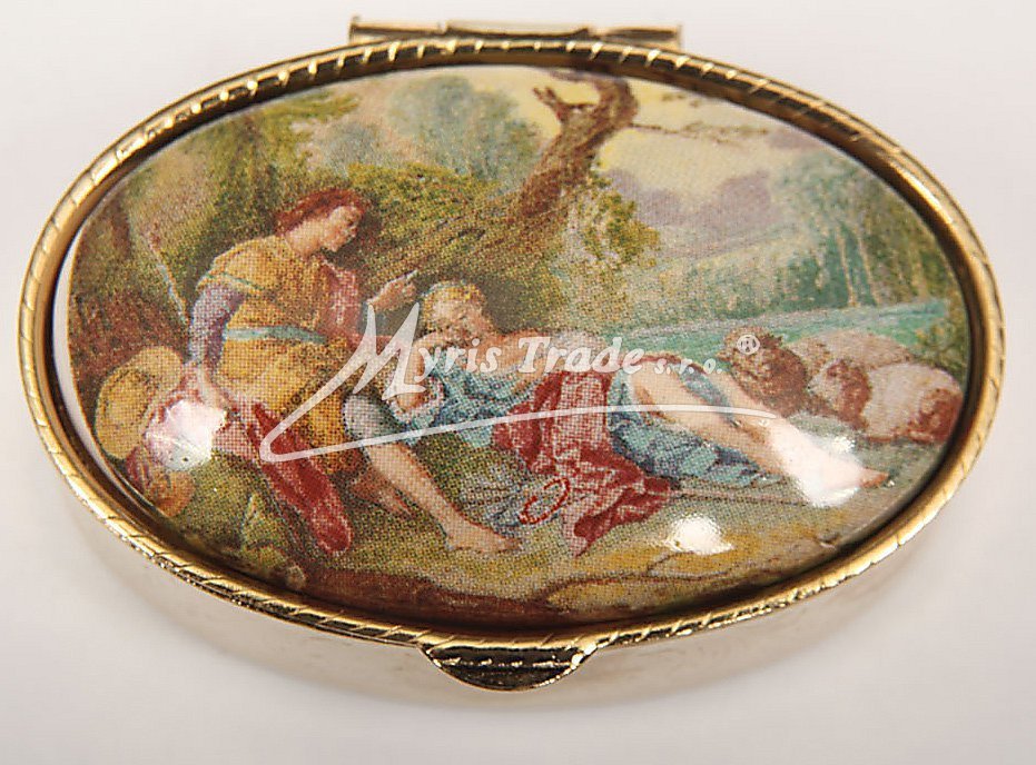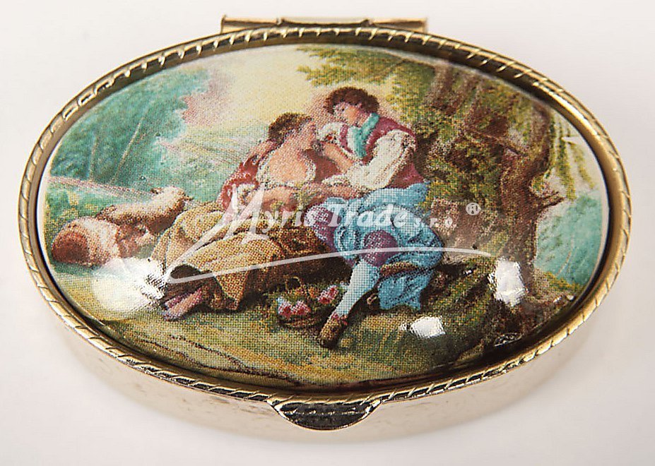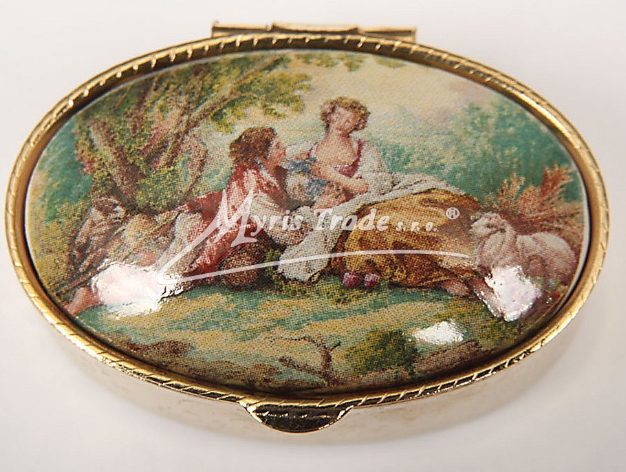 klasická oválná lékovka je vyrobena z kovu zlaté barvy s porcelánovým víčkem s romantickým motivem v různém provedení