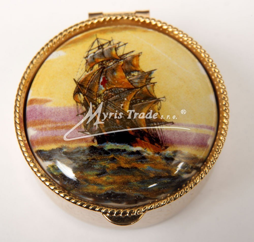 klasická kulatá lékovka je vyrobena z kovu zlaté barvy s porcelánovým víčkem s motivem historické plachetnice