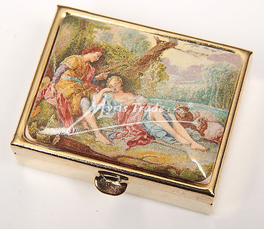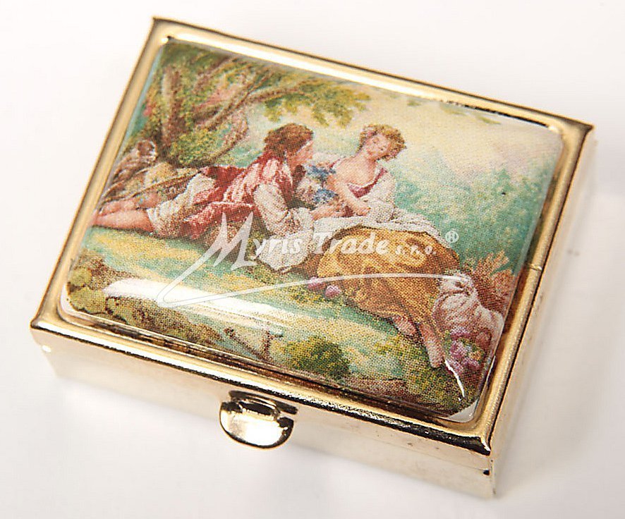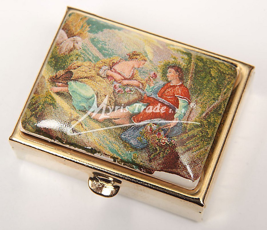 klasická obdélníková lékovka je vyrobena z kovu zlaté barvy s porcelánovým víčkem s romantickým motivem v různém provedení