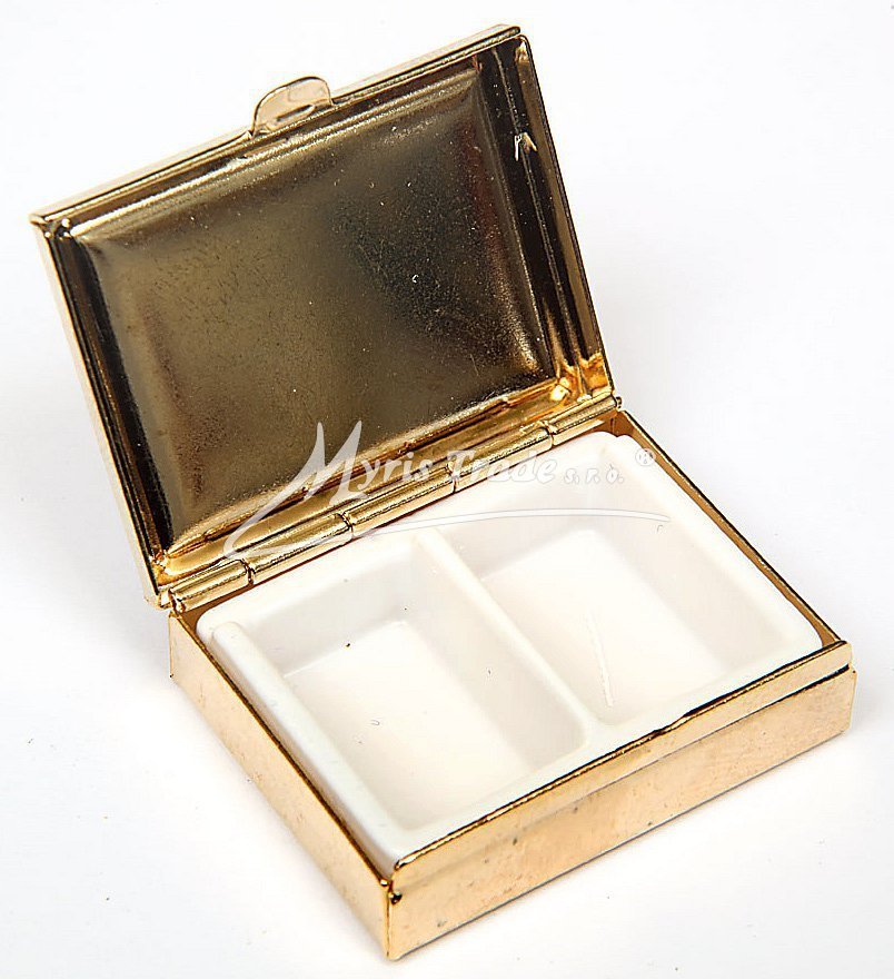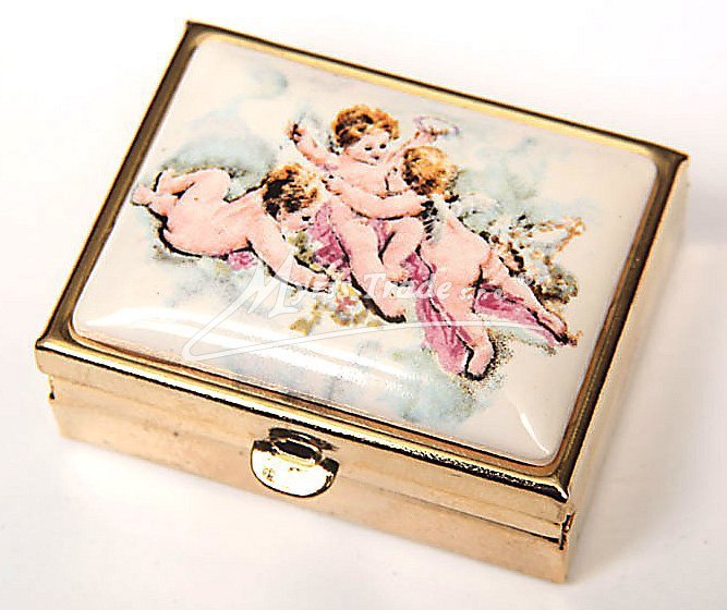 klasická obdélníková lékovka je vyrobena z kovu zlaté barvy s porcelánovým víčkem s motivem andílků
