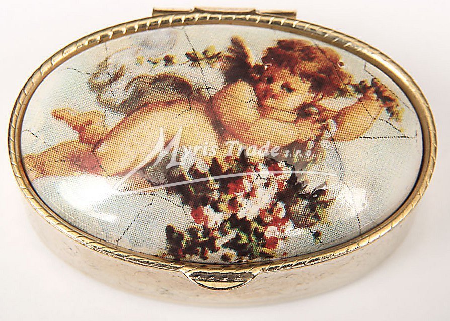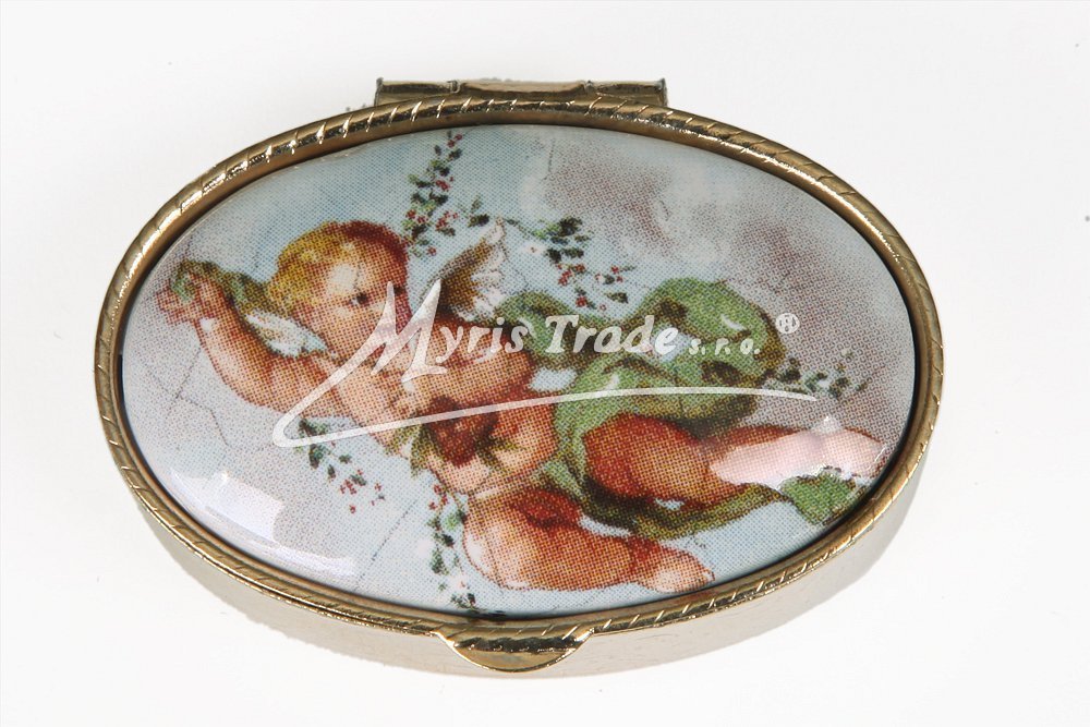 klasická oválná lékovka je vyrobena z kovu zlaté barvy s porcelánovým víčkem s motivem andílků